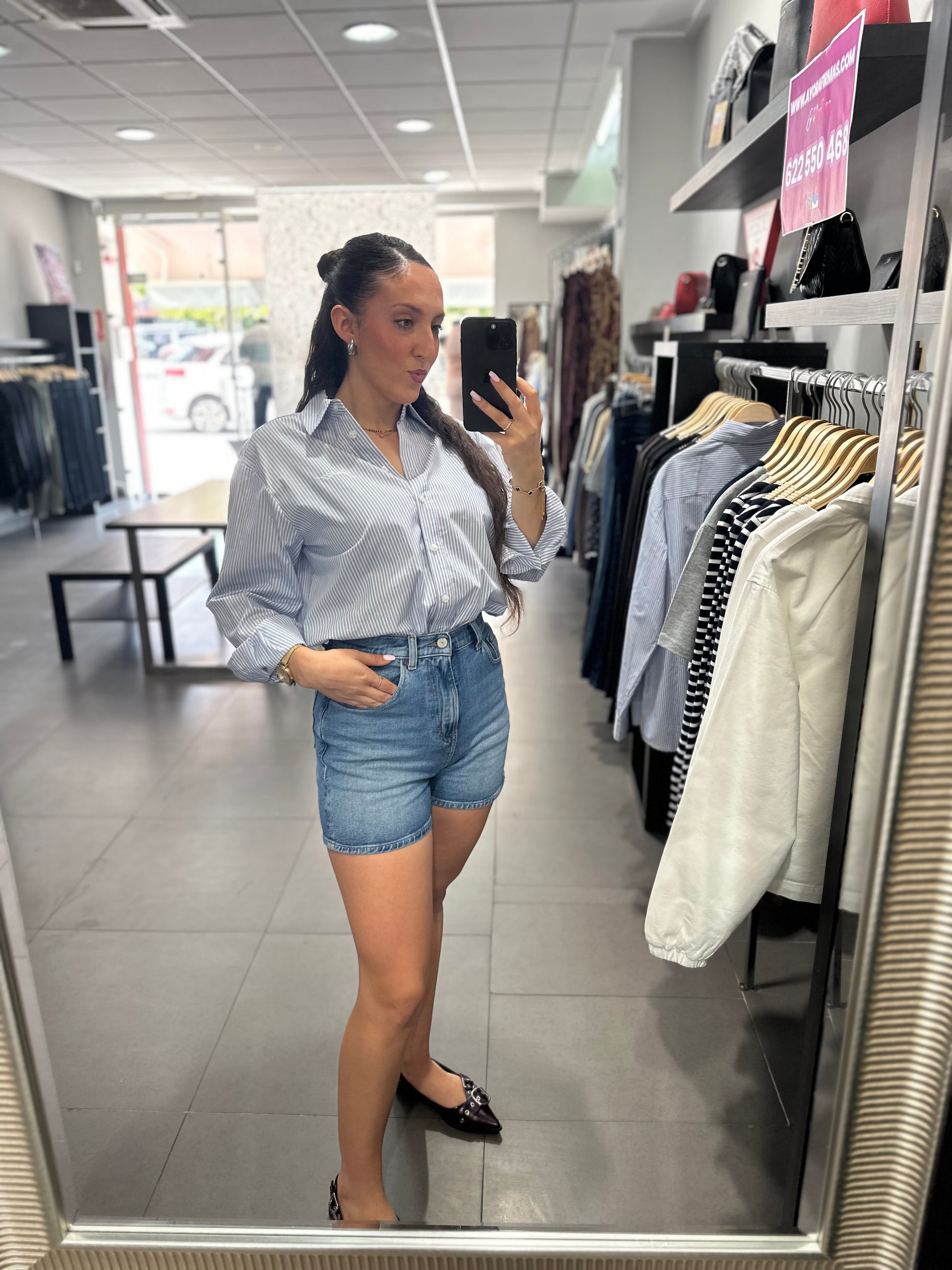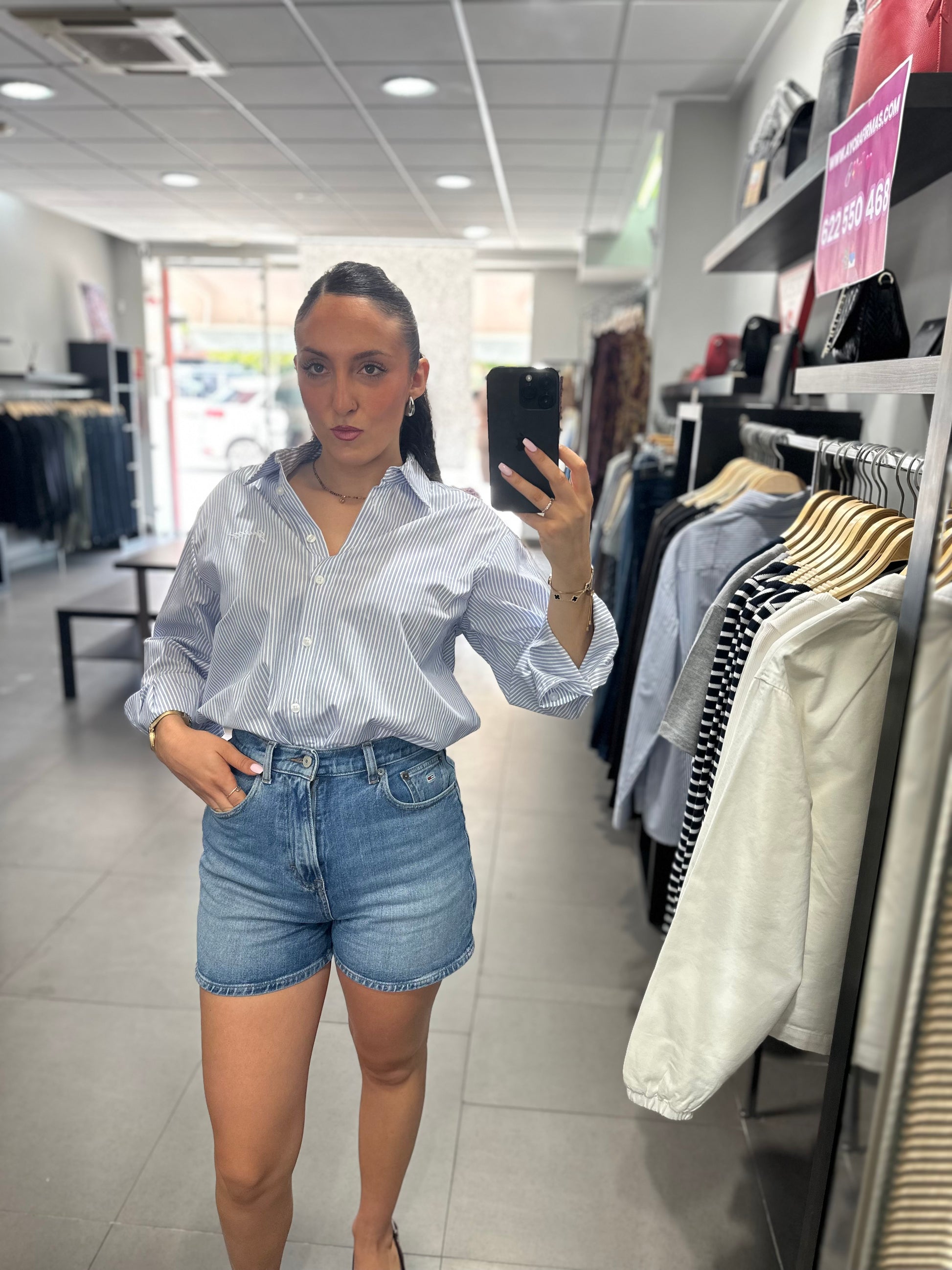 CAMISA GUESS OVERSICE RALLAS AZUL Y BLANCO CON LOGO BORDADO