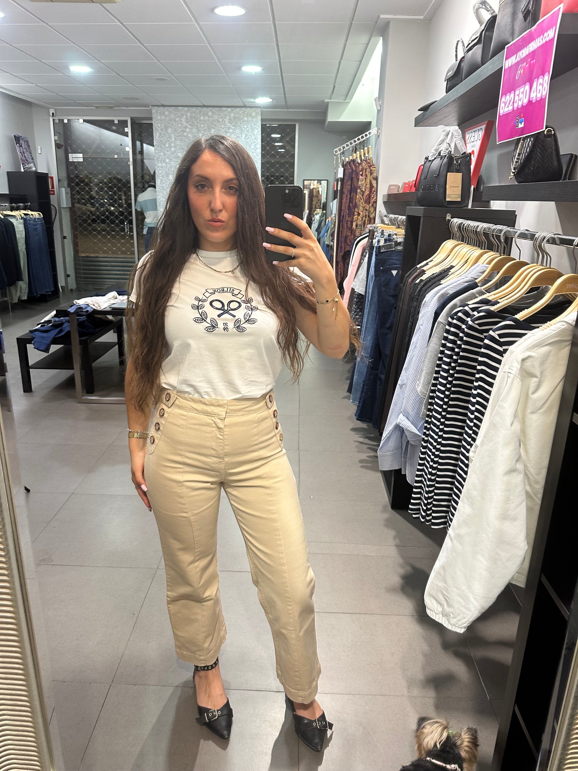PANTALÓN SILBON VAQUERO BEIGE CULOTTE CON BOTONES Y LOGO BORDADO