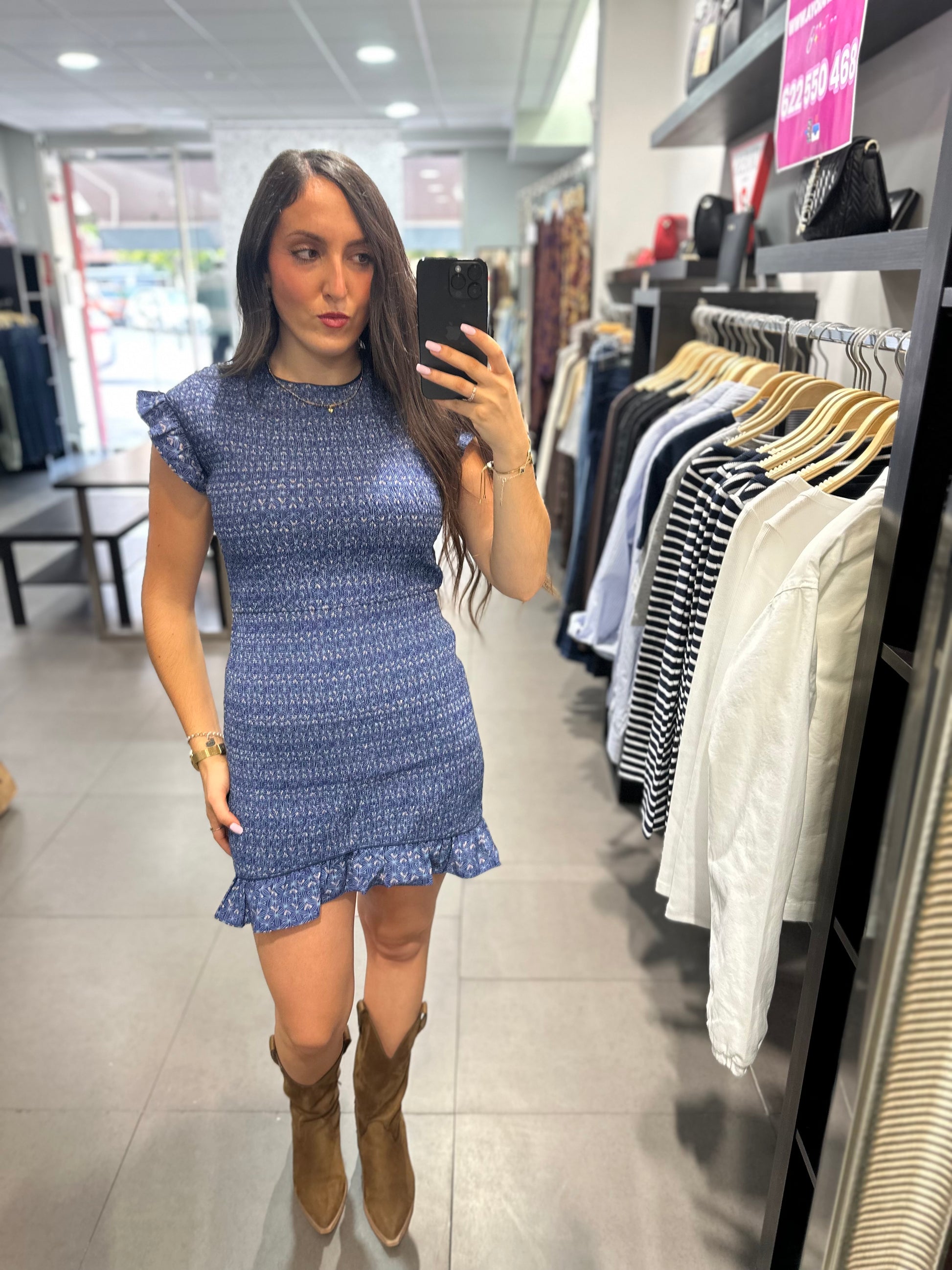 VESTIDO SILBON PANEL DE ABEJA AZUL CON VOLANTES EN MANGAS Y BAJO